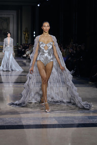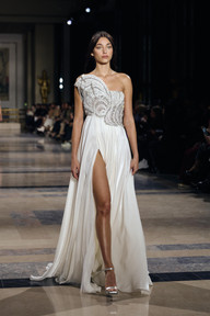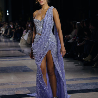 Puis, la nuit est tombée, et avec elle, les étoiles ont illuminé le podium. Les robes, parsemées de sequins scintillants et de broderies métalliques, ont transformé chaque modèle en une déesse nocturne. Les lignes ondulantes et les jeux de transparence ont ajouté une dimension céleste à chaque création, tandis que les détails astraux, comme les étoiles brodées et les croissants de lune, ont renforcé le thème cosmique.