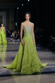 Alors que la nuit touchait à sa fin, la collection a évolué vers des tonalités plus claires. Le blanc immaculé, le vert d’eau et le bleu ciel ont fait leur apparition, symbolisant le retour de la lumière. Les robes, toujours aussi majestueuses, se sont parées de volants et de drapés, évoquant les premières lueurs de l’aube.